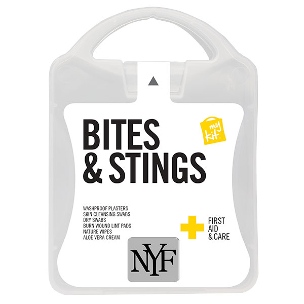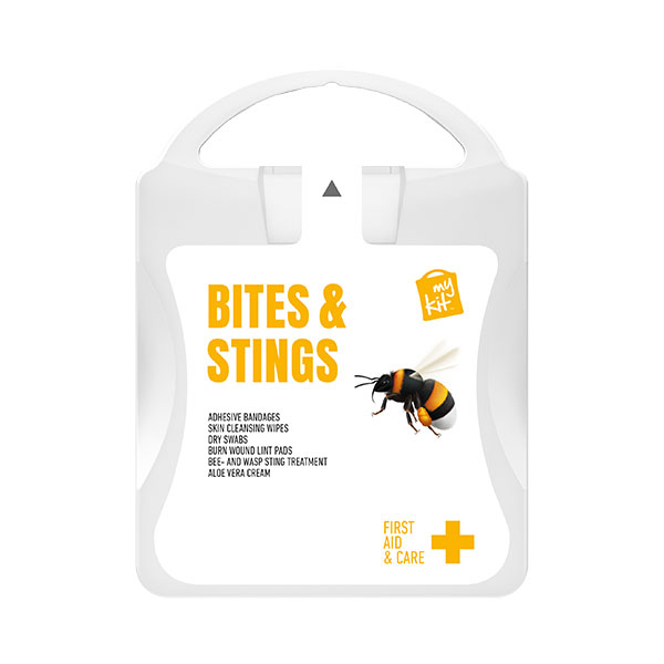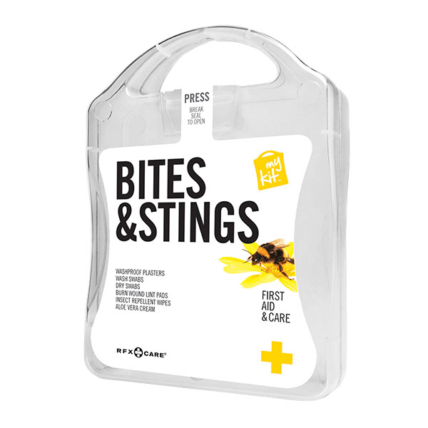 Contains adhesive bandages, skin cleansing wipes, dry swabs, burn wound lint pads, bee and wasp sting treatment and aloe vera cream